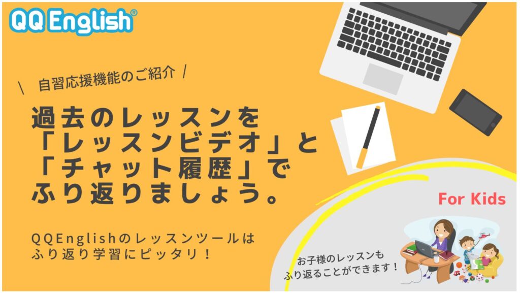 QQEnglishのマイページ上で再生できて、レッスンの内容を丸ごと見返すことができます。