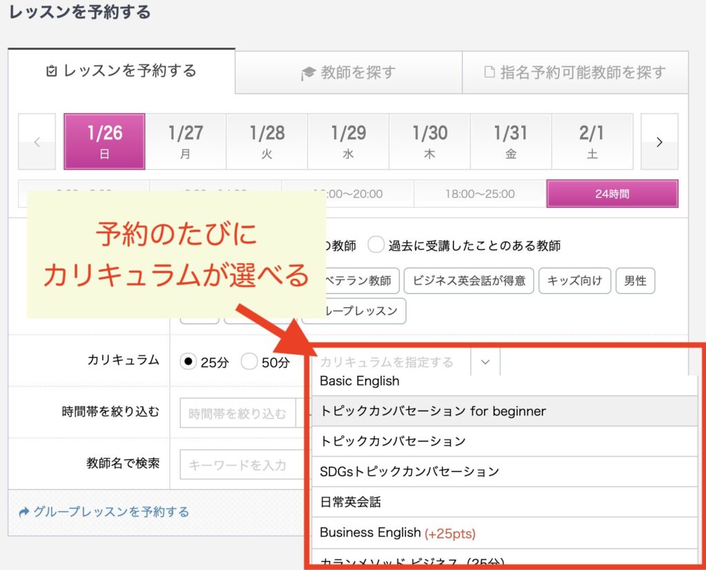 QQEnglishは、下の画像のように予約のタイミングで好きなカリキュラムが選べるんです。