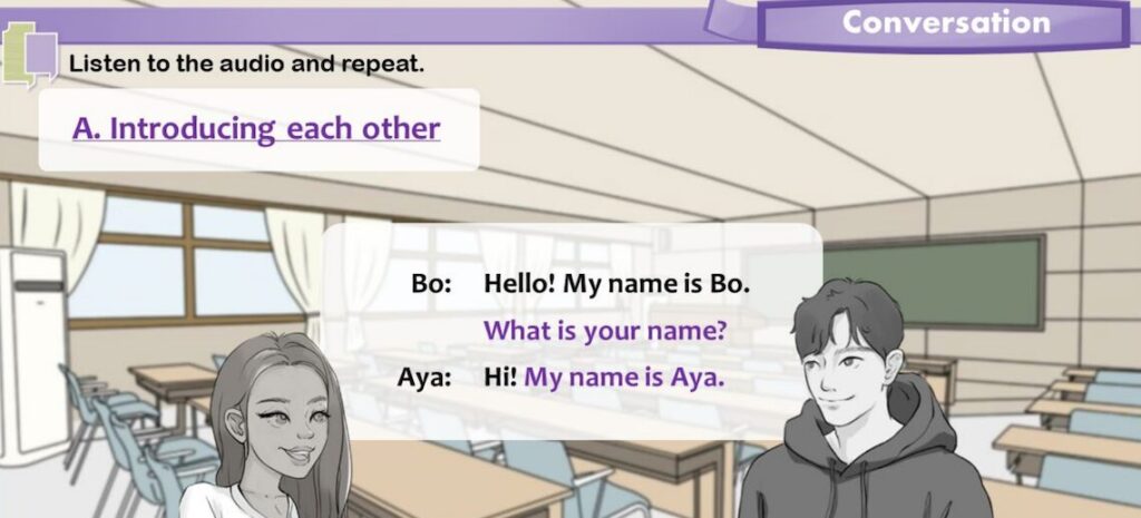 講師が登場すると、Helloからはじまり、「もうお昼ご飯食べた?」など簡単な雑談をします。