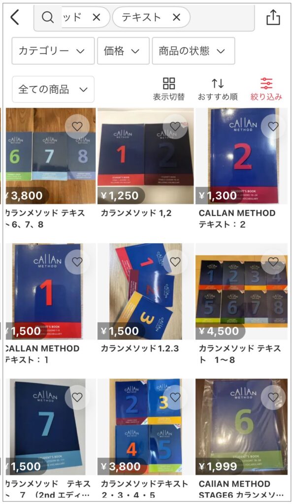 実際にメルカリで「カランメソッド テキスト」と検索してみると・・