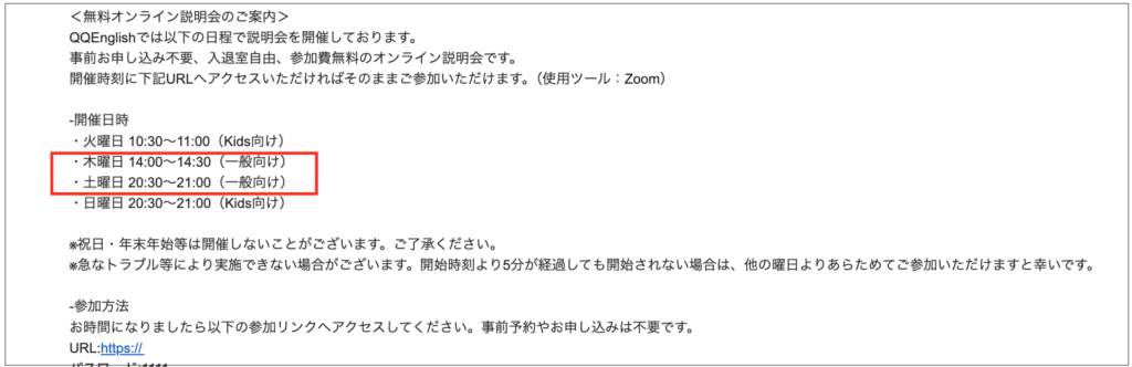 QQEnglishでは、無料体験を受けた人向けにオンライン説明会が開かれています。