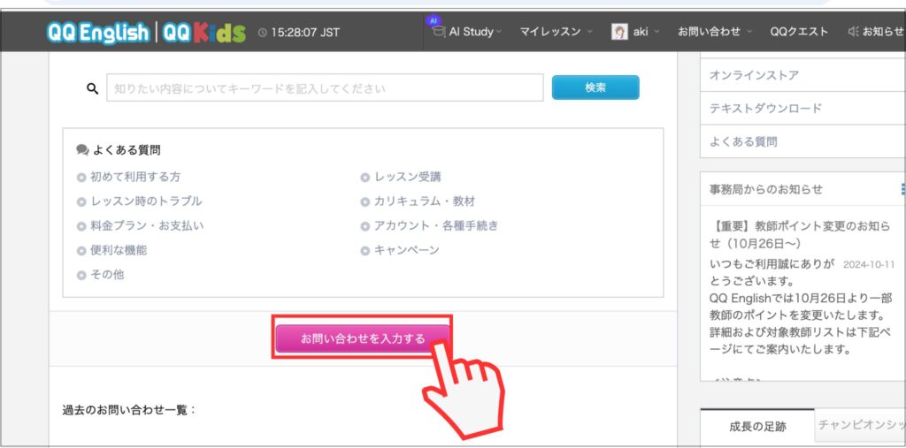 QQEnglishは、マイレッスンページにお問い合わせフォームがあります。